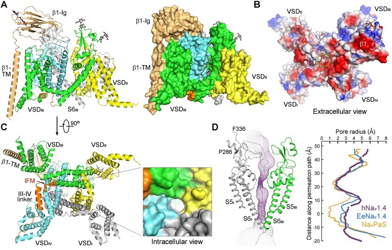 (A)人源Nav通道Nav1.4-β1的跨膜区和胞外区结构得到很好的解析;(B)从胞外侧看Nav1.4-β1有大面积的负电区域;(C)Nav1.4-β1的中央孔道从胞内侧看是开放状态;(D)计算Nav1.4-β1的中央孔道的半径。