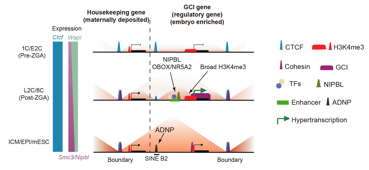 在动物早期胚胎发育中,受精后的父母源基因组会经历一次大规模的三维染色质结构重塑。基因组常见的结构如拓扑相关结构域(topologically associating domains, TADs)和区室(compartments)几乎存在于所有细胞中。但在受精后,TADs和compartments迅速解体,同时染色质呈现出一种高度松弛的状态。这种结构的“擦除”被认为有助于重置基因调控网络,为胚胎发育启动提供新的起点。该过程在目前所有已研究的动物早期胚胎(包括果蝇、爪蟾、斑马鱼、青鳉鱼、小鼠、猪以及人类)中均高度保守。另一方面,染色质高级结构的逐步重建同时伴随着合子基因组激活(zygotic genome activation, ZGA)的发生。然而,在哺乳动物中这一过程中染色质结构是如何被建立,以及其与生命的第一次基因表达之间的关系仍然知之甚少。