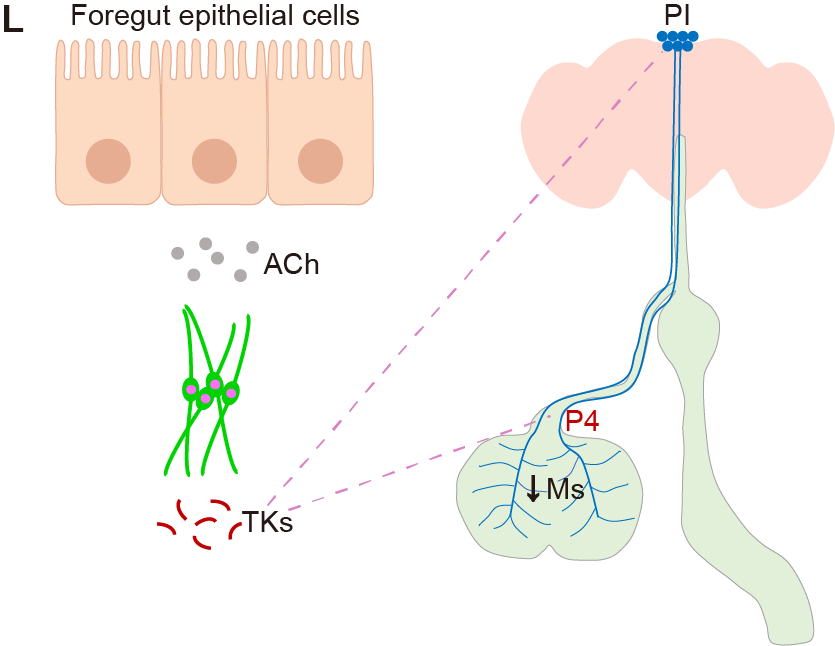 图4:气管细胞释放速激肽作用于P4泵和PI神经元的环路示意图