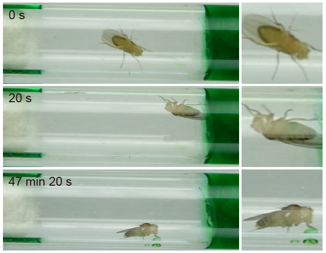 图1:自由活动的果蝇在进食小檗碱溶液后发生呕吐
