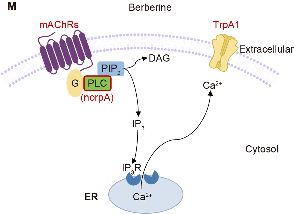 图2:小檗碱刺激前肠上皮细胞释放乙酰胆碱,间接激活TrpA1的分子通路示意图