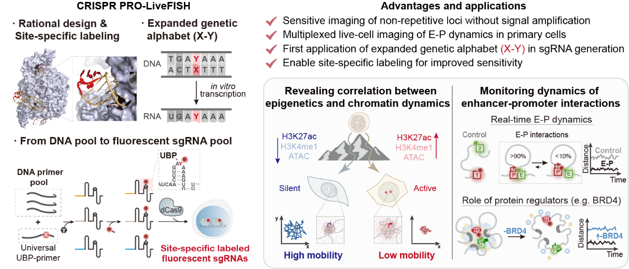 研究团队在此前CRISPR LiveFISH技术的基础上进行了系统性升级,首次在CRISPR系统的引导RNA(sgRNA)标记中引入拓展遗传字母表中的正交非天然碱基对(unnatural base pairs, UBPs),结合Cas9/sgRNA结构指导的理性设计,实现了位点特异性的sgRNA荧光标记,显著提升了染色质活细胞成像的灵敏度和信噪比。PRO-LiveFISH可同时实现多达6个基因位点的多色动态观测,在无需信号放大的情况下,仅使用约10条sgRNA可有效标记非重复基因位点,适用于包括原代细胞在内的多种细胞类型。