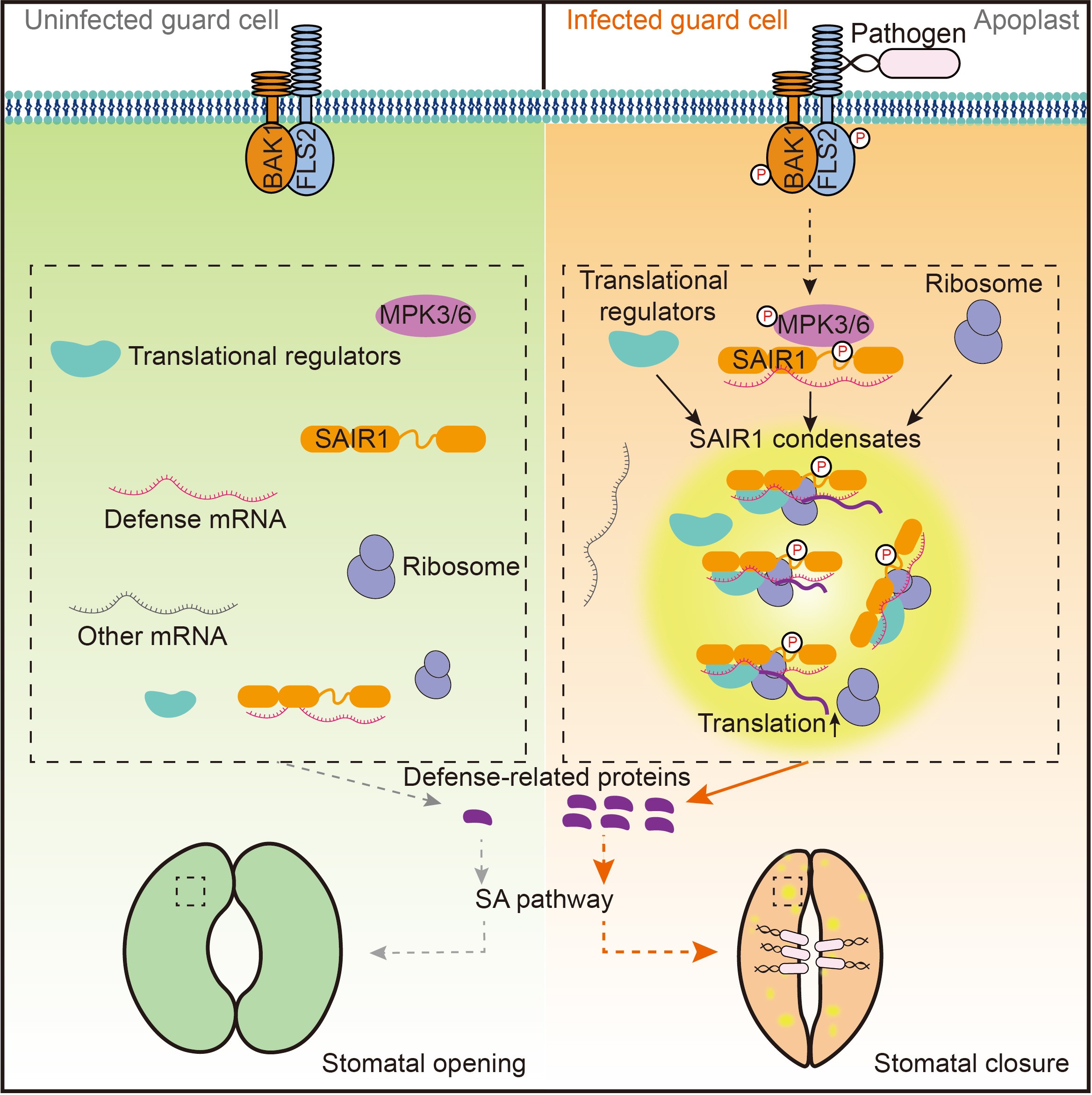 气孔(stomata)是植物叶片表皮成对保卫细胞及空腔组成的开孔结构。多种致病细菌和真菌通过气孔入侵植物引发严重的植物病害。保卫细胞则会感知病原菌信号,关闭气孔以限制病原菌入侵,该过程被称为气孔免疫(stomatal immunity),构成植物有效阻止病原菌入侵的首要防线。解析气孔免疫的分子机制对于防治植物病害具有重要意义。植物细胞存在液-液相分离驱动形成的生物分子凝聚体,在植物生长发育和环境适应中发挥重要作用。然而,是否存在保卫细胞特异凝聚体调控气孔免疫及其分子机制尚不清楚。