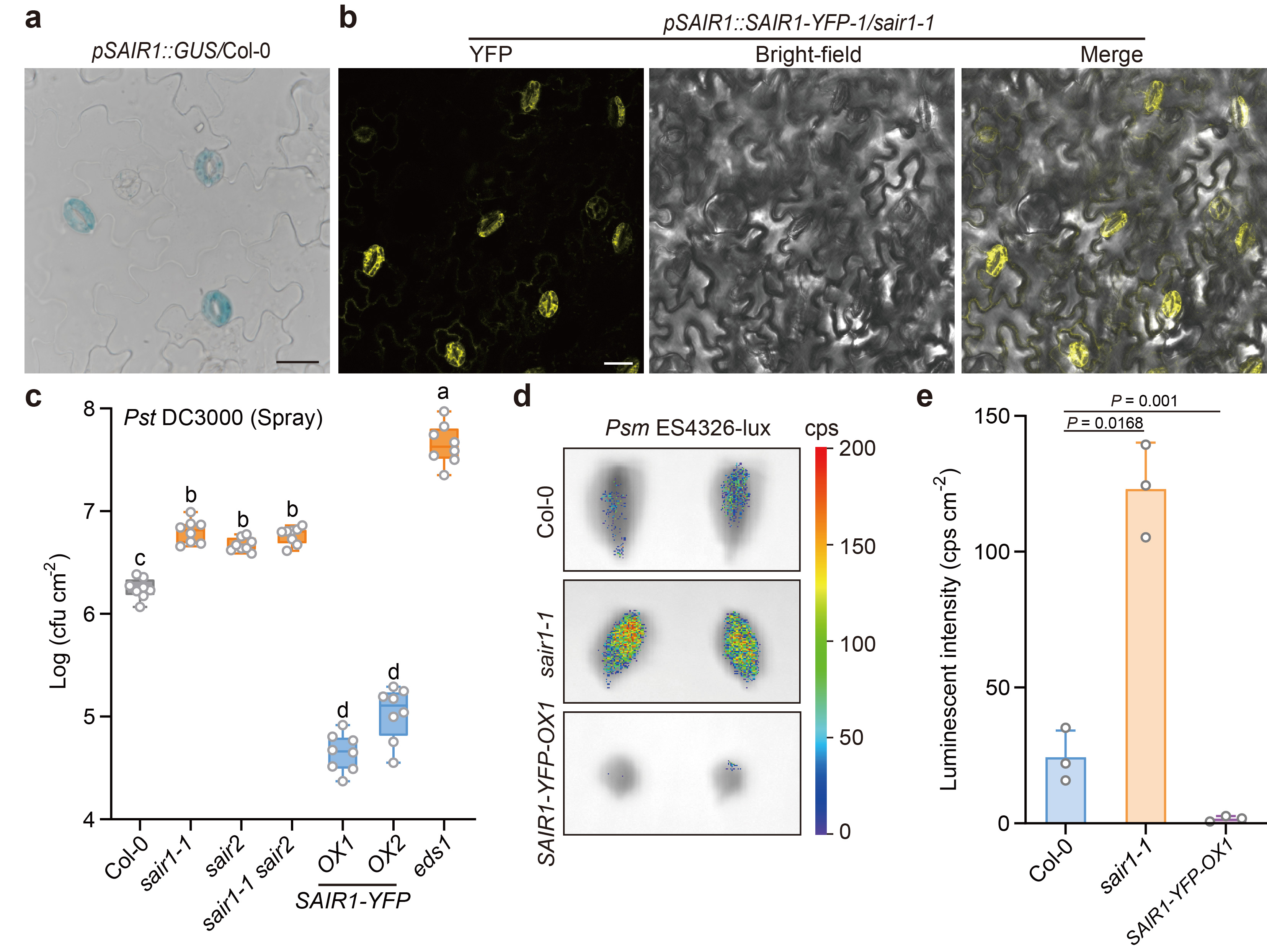 为鉴定保卫细胞特异的相分离蛋白,作者首先通过b-isox小分子筛选,结合保卫细胞蛋白质组学数据,筛选到一个在保卫细胞中高表达的RNA结合蛋白,将其命名为SAIR1(stomatal immune RNA-binding protein 1)。研究表明,SAIR1偏好在保卫细胞中表达,正调控气孔免疫。